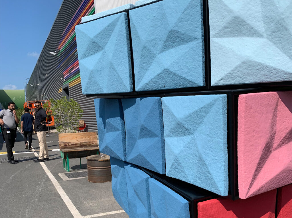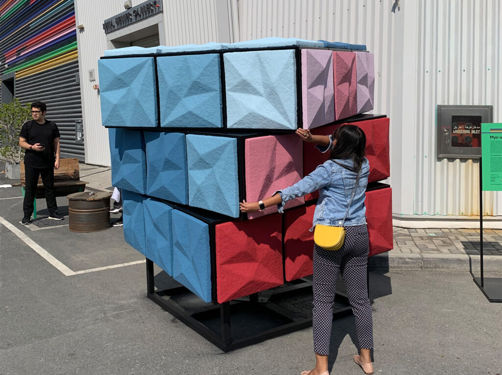 Myc-ubik was installed twice; once as an installation at Quoz Art Fest in Alserkal Avenue in Dubai, and once more to become the first mycelium public art in the UAE to be displayed on Al Maryah Island in Abu Dhabi next to Abu Dhabi Global Market (ADGM).