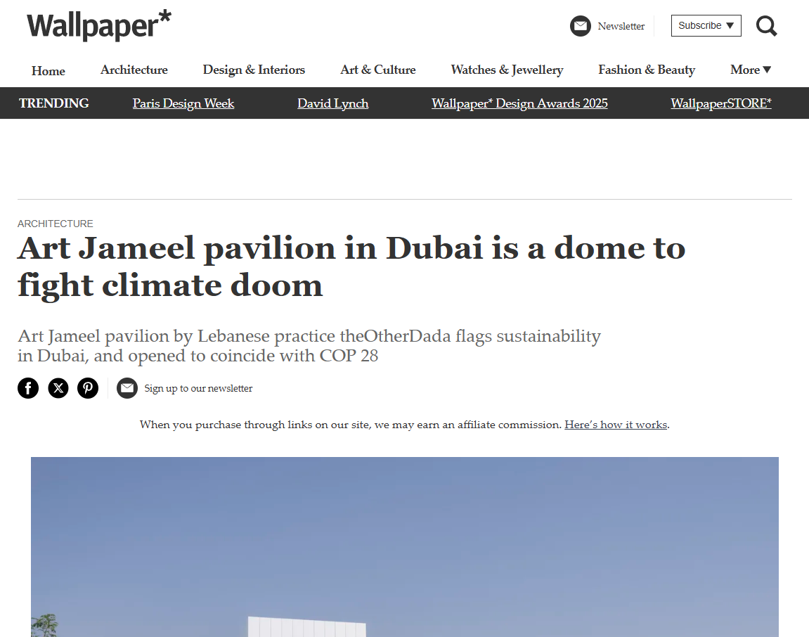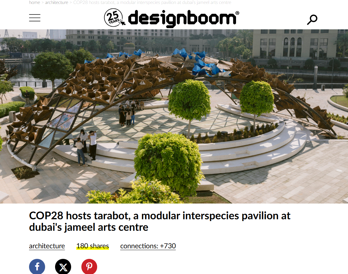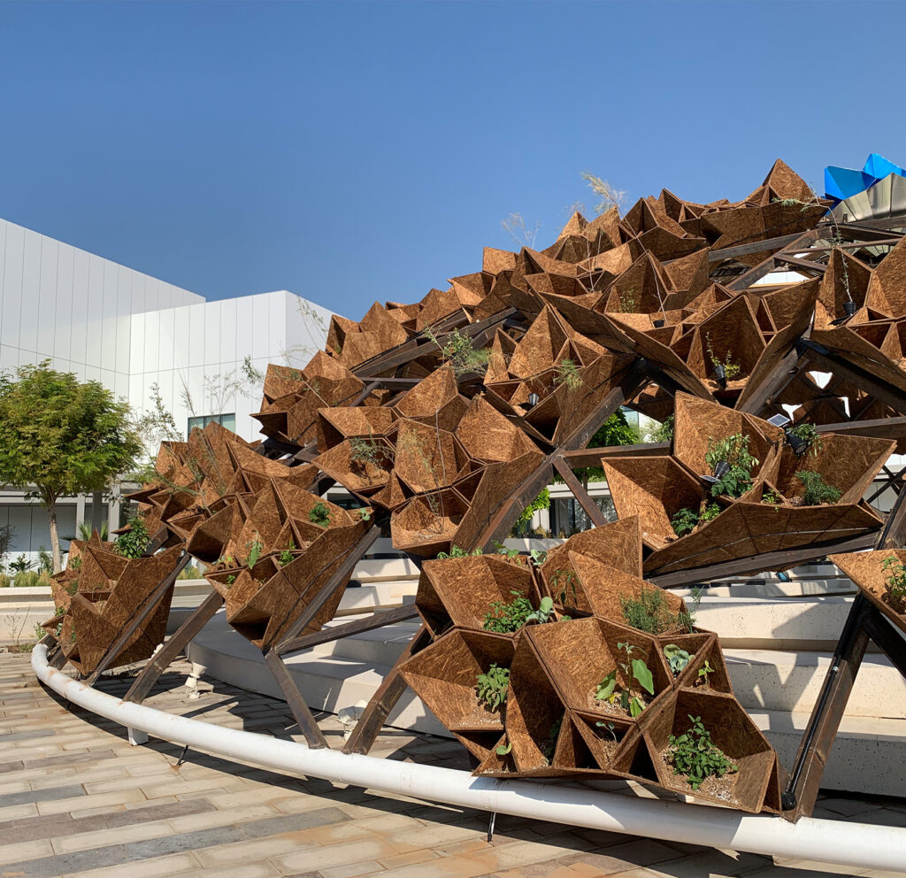 Tarabot, which means interconnectedness in Arabic, is commissioned by Art Jameel and designed by the OtherDada with collaborations with UAE companies supplying local material that is upcycled from local waste, particularly palm waste which is abundantly available in the UAE. The concept of the pavilion incorporates construction and de-installation through a full lifecycle approach. After de-installation, the modular cones will be repurposed for domestic planting on land with the metal structure taking on new life as underwater habitat for coral and fish, linking life on land to life underwater.