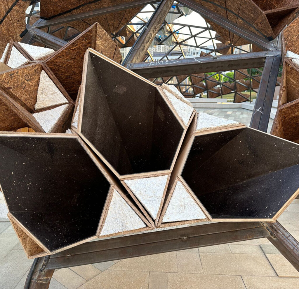 MycoSphere, joined forces with local material innovators to supply the pavilion with the first UAE produced mycelium material using palm waste. At the end of its lifecycle, the mycelium panles will go back to Mother Earth as soil nourishment to further support the regeneration of nature.